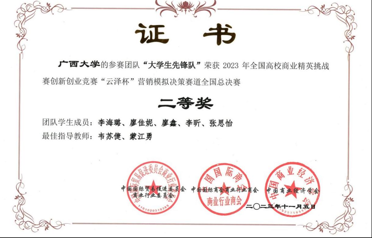 近日,2023年全国高校商业精英挑战赛创新创业竞赛“云泽杯”营销模拟决策赛道全国总决赛落下帷幕。该赛项从校赛到全国总决赛共计2000多支队伍参赛,在全国预选赛中,蘑菇视频选送的3支代表队与来自全国26个省、自治区、直辖市的近300所高等院校1000多支参赛队伍同台竞技,最终斩获国赛一等奖一项,二等奖两项。比赛由韦苏倢、李红、蒙江勇三位老师共同指导,其中,卡比巴拉代表队表现尤为突出,成功晋级了全国总决赛精英赛。