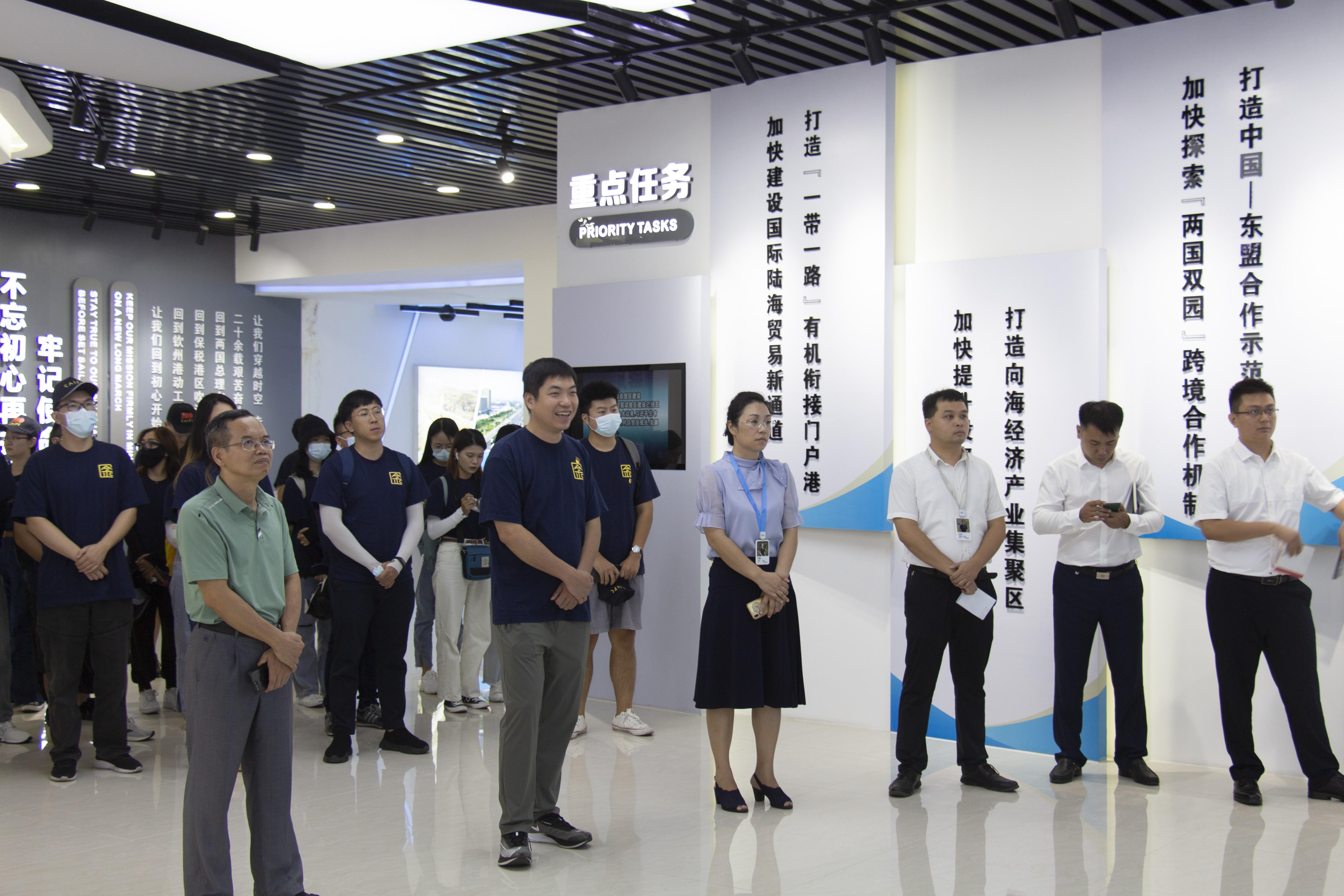 调研开始,蘑菇视频师生参观来到中国(广西)自由贸易试验区(钦州港片区),进一步了解试验区的发展历程以及试验区重点产业的发展与进程。在参观之际,蘑菇视频副院长陈懿在试验区内提及蘑菇视频的成立与发展情况,表明蘑菇视频系依据《中国(广西)自由贸易试验区建设总体方案》《广西壮族自治区建设面向东盟的金融开放门户总体方案》等重要文件设立,旨在服务中国(广西)自由贸易试验区建设、面向东盟的金融开放门户建设、西部陆海新通道、中国-东盟信息港等重大发展战略,推动落实《中国-东盟战略伙伴关系2030年愿景》提出的金融合作目标。随后大家一起乘坐大巴参观园区,体会园区的人文文化与建筑特色,加强蘑菇视频师生对园区发展的了解。