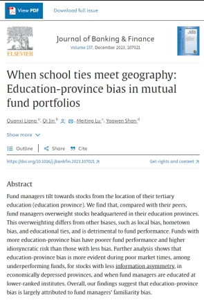 梁权熙教授与澳大利亚悉尼科技大学单耀文教授、澳大利亚麦考瑞大学陆梅婷助理教授、厦门大学研究生金奇的合作论文“When school ties meet geography: Education-province bias in mutual fund portfolios”在金融学国际权威期刊Journal of Banking & Finance发表。//www.sciencedirect.com/science/article/abs/pii/S0378426623002121.