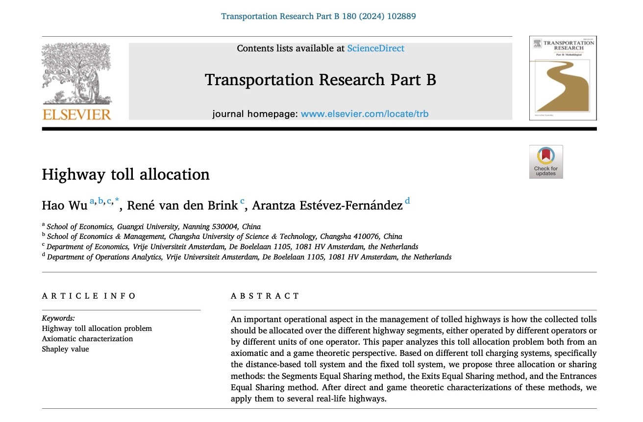 近日,蘑菇视频边疆经济研究团队成员吴昊助理教授在交通运输领域顶级期刊《Transportation Research Part B: Methodological》上,发表题为“Highway toll allocation”(高速公路收益分配)的论文。吴昊助理教授为第一作者和通讯作者,合作者包括阿姆斯特丹自由大学/丁伯根研究所经济学教授雷内(Réne van den Brink)、运筹与管理学助理教授阿兰扎(Arantza Estévez-Fernández)。