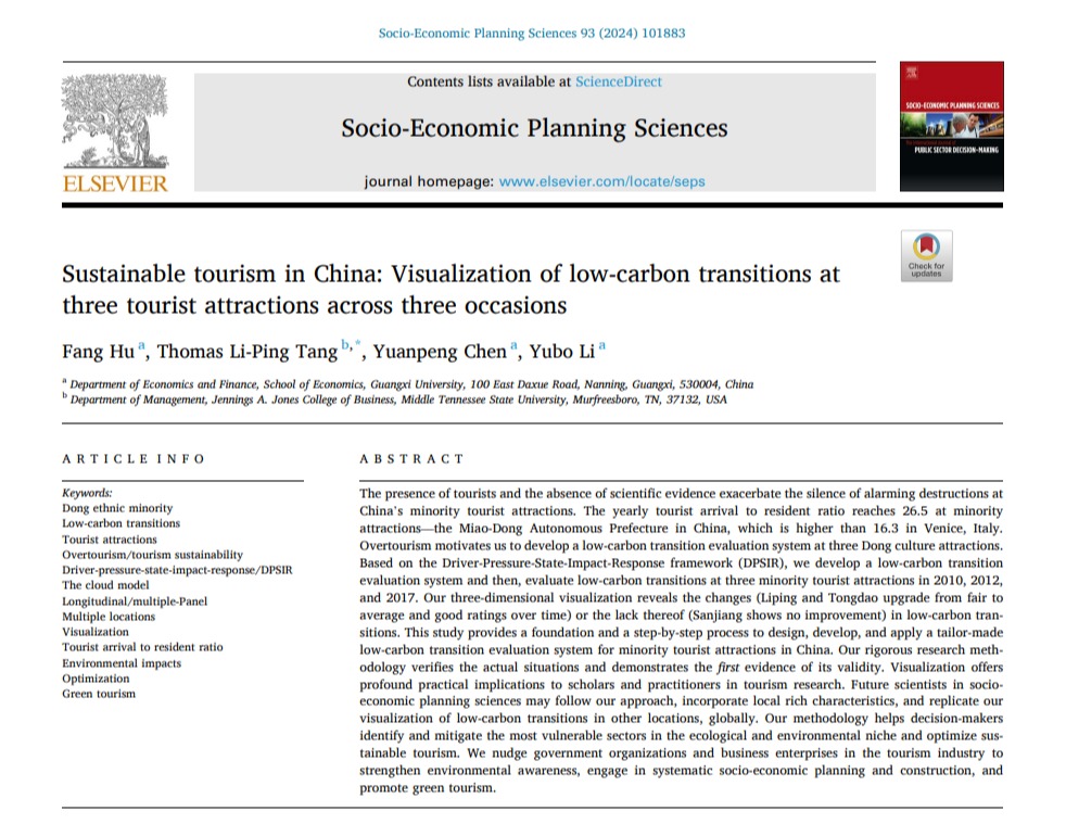 日前,蘑菇视频胡芳老师作为第一作者与硕士研究生陈渊鹏和李誉博、美国中田纳西州立大学Thomas Li-Ping Tang教授共同完成的学术论文“Sustainable Tourism in China: Visualization of Low-Carbon Transitions at Three Tourist Attractions across Three Occasions”(《中国的可持续旅游:三个旅游景点在三个时期的低碳转型可视化》)在经济学领域国际权威期刊Socio-Economic Planning Sciences在线发表。该研究得到国家自然科学基金委和蘑菇视频