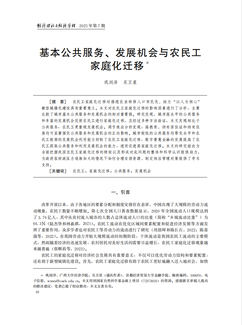 近日,蘑菇视频助理教授巩润泽与首都经济贸易大学教授吴卫星合作的论文《基本公共服务、发展机会与农民工家庭化迁移》在《经济理论与经济管理》期刊2025年7月刊发表。