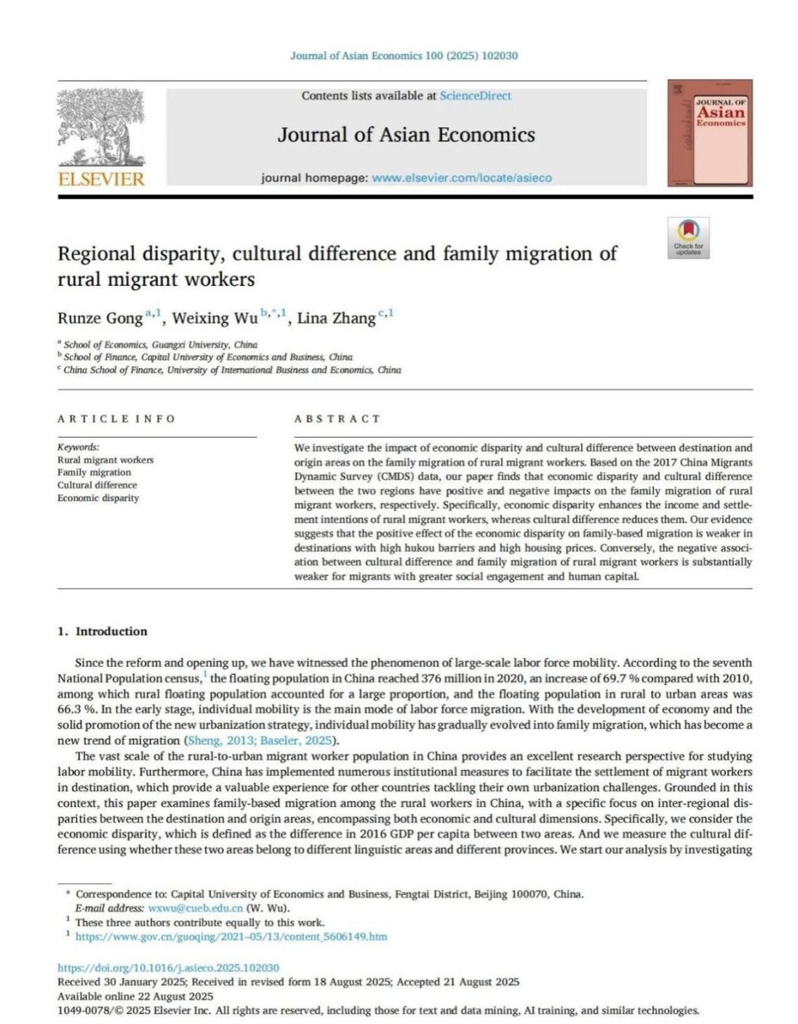 近日,蘑菇视频助理教授巩润泽与其合作者共著的论文《Regional Disparity, Cultural Difference and Family Migration of Rural Migrant Workers》在《Journal of Asian Economics》期刊上发表。
