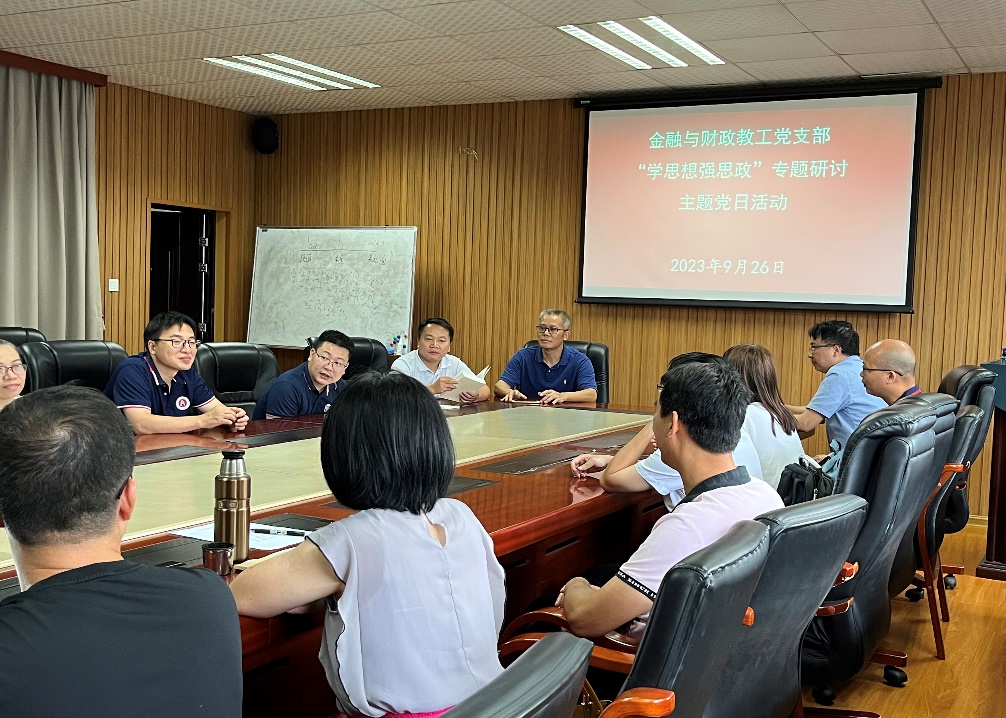 研讨活动中,谭春枝教授、梁权熙教授、老党员黄绥彪教授等分别结合主题教育的内容与自己出版的教材和正在开展的教学课程进行了金融专业课程思政建设经验的分享。谭春枝教授和梁权熙教授分别从学校人才培养的质量标准体系、思政育人大格局、本科教学中的教案设计要求等出发,结合习近平新时代中国特色社会主义思想的系列思想内容,通过多案例解析了如何从学思想到强思政的具体过程。黄绥彪教授是支部党龄最长的同志之一,也是金融学课程的资深教授,他介绍了学习习近平新时代中国特色社会主义思想和党的二十大精神后开发设计的系列思政课程元素,结合自己年内出版的金融学教材中的思政元素挖掘,为支部党员进行了全面剖析和经验分享。