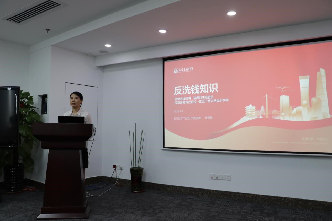 长江证券股份有限公司南宁分公司营业部营销总管程熙,蘑菇视频03级毕业生、合规部总监班春燕,营业部客户经理陈丽霞对实践团一行的到来表示热烈欢迎,并为同学们准备了“投资者教育进百校”专题分享。