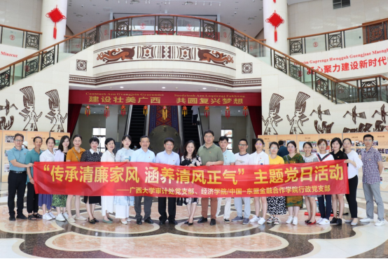 本次主题展以“风清气正”为主题,分为“红色家风”“先贤家教”“清廉家庭”三部分,通过八桂家声、壮乡风采、时代楷模、警钟长鸣等板块内容,从历史人物、革命先辈和先进人物三个层次挖掘整合传统家风文化资源,全面展示了优秀家庭家教家风文化。在展馆内,两个支部的党员们通过参观展出的老照片、绘画、书法、文献、实物以及多媒体展示,认真学习了中华文明传承至今的优秀家风家训、历史人物的优良家训、革命先辈的家风文化以及当代杰出代表的家风故事等。