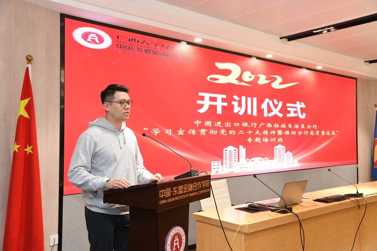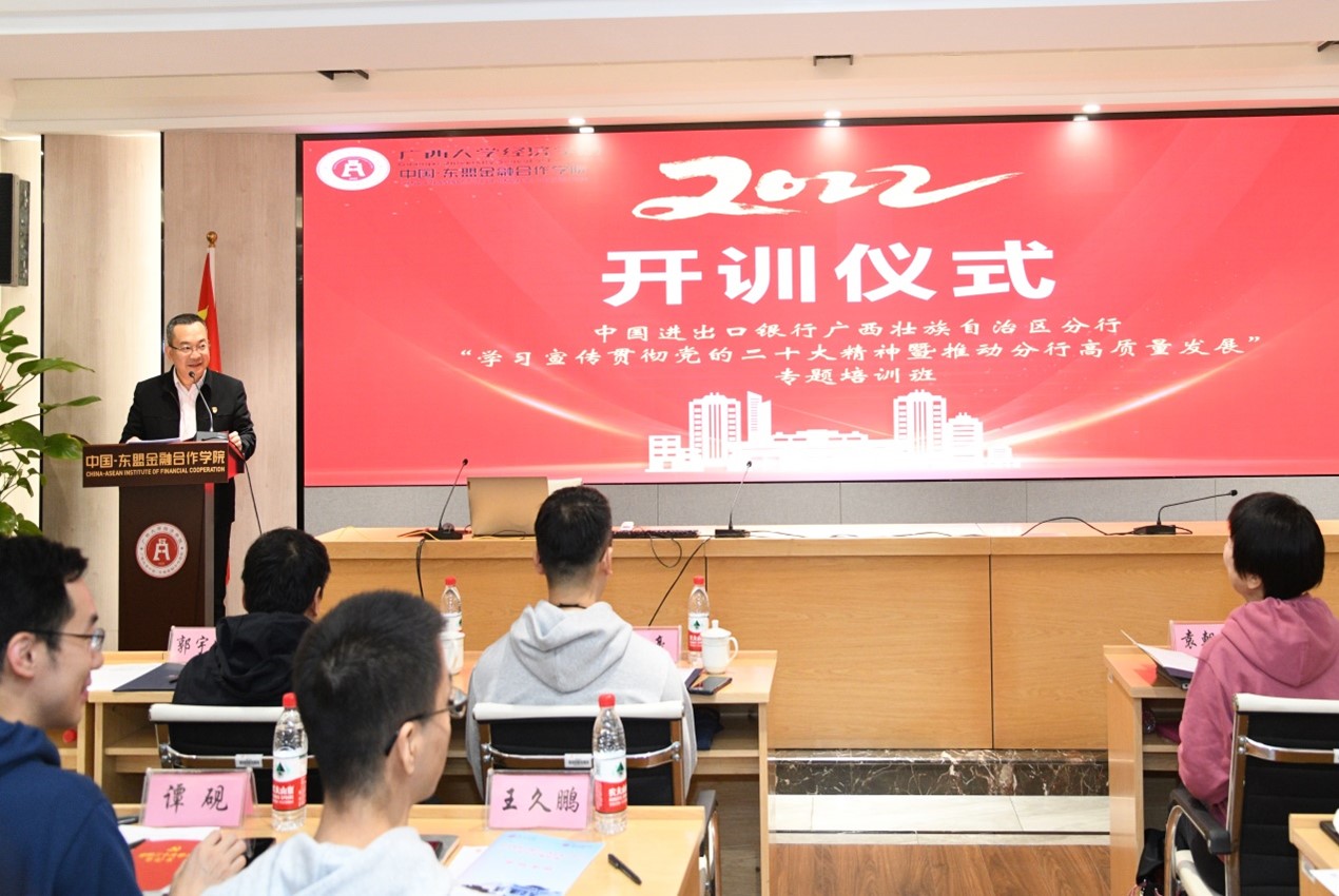 开班仪式上,首先由李光辉院长进行致辞,李院长提出本次为助力中国进出口银行广西分行高质量发展,蘑菇视频根据该行的实际业务需求和发展规划,提供定制化的专业培训课程,课程内容主要集中在深度解析党的二十大热点问题、提升业务能力等方面。培训旨在形成稳定而富有成果的交流机制,拓展前沿视野、迸发创新思想、促进理论与实践相结合,提高中国进出口银行广西分行受训人员的领导能力和管理能力,提高相关人员的理论水平与实际业务能力,着力促进中国进出口银行广西分行业务发展、深化服务。