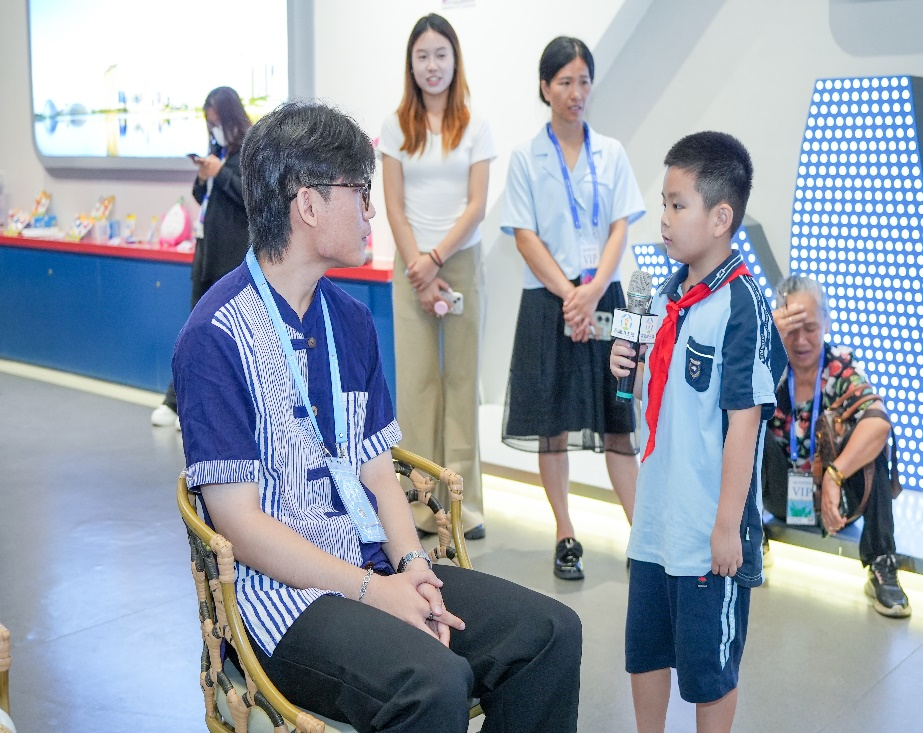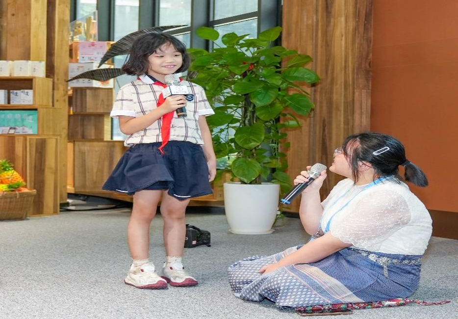 高佳恩、郭梓萱在中国—东盟特色商品汇聚中心广西馆与小学生互动