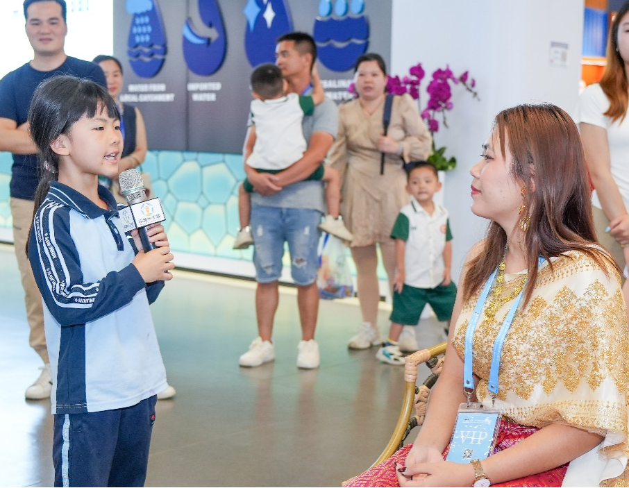 活动中,四位留学生分为两组,分别在中国广西馆和新加坡馆与80名中国小学生展开面对面交流。通过图文展示、趣味讲解和互动游戏,留学生们生动介绍了泰国的传统服饰、宋干节等特色节日以及美食文化。小朋友们热情参与,现场气氛活跃。