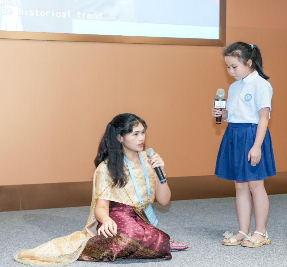 “采访小记者”环节迎来了活动的高潮。小学生们争先恐后地提问“泰国人早餐吃什么”“你们国家也过春节吗”“泰语‘你好’怎么说”留学生们耐心解答,用幽默的语言和亲切的态度拉近了彼此的距离。双方在欢声笑语中完成了真挚的文化对话。