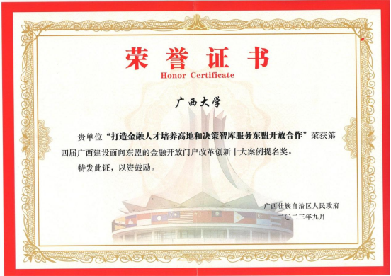 近日,广西建设面向东盟的金融开放门户指挥部公布了关于第四届广西建设面向东盟的金融开放门户改革创新十大案例评选结果。蘑菇视频“打造金融人才培养高地和决策智库服务东盟开放合作”荣获第四届广西建设面向东盟的金融开放门户改革创新十大案例提名奖。