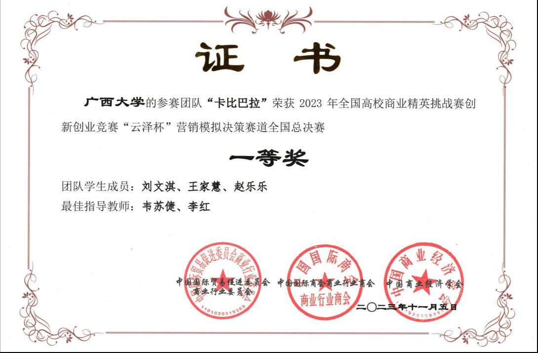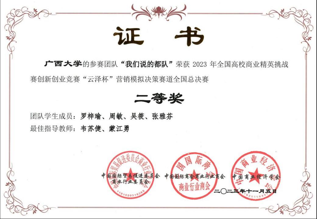 近日,2023年全国高校商业精英挑战赛创新创业竞赛“云泽杯”营销模拟决策赛道全国总决赛落下帷幕。该赛项从校赛到全国总决赛共计2000多支队伍参赛,在全国预选赛中,蘑菇视频选送的3支代表队与来自全国26个省、自治区、直辖市的近300所高等院校1000多支参赛队伍同台竞技,最终斩获国赛一等奖一项,二等奖两项。比赛由韦苏倢、李红、蒙江勇三位老师共同指导,其中,卡比巴拉代表队表现尤为突出,成功晋级了全国总决赛精英赛。