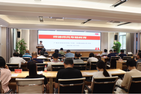 教育会上,院党委书记陆善勇教授带领全院教职工集中学习了习近平总书记关于师德师风建设的重要论述和相关政策法规文件,号召老师们务必进德修业,树牢廉洁意识,坚持底线思维,持节守正,洁身自好,坚决抵制不良风气侵蚀,带头做社会正气的捍卫者、弘扬者、引领者,以赤诚之心、奉献之心、仁爱之心投身高等教育事业,在取得高质量教学科研成果的同时不断提高自身道德修养,以模范行为影响带动学生成长成才。