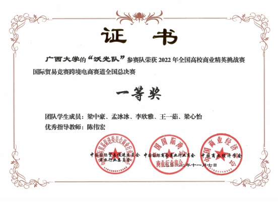 的大力支持下,在国贸系王娟教授与陈伟宏助理教授的共同指导下,蘑菇视频参赛团队在跨境电商赛道中斩获全国一等奖、在国际贸易业务模拟赛道中斩获全国二等奖。