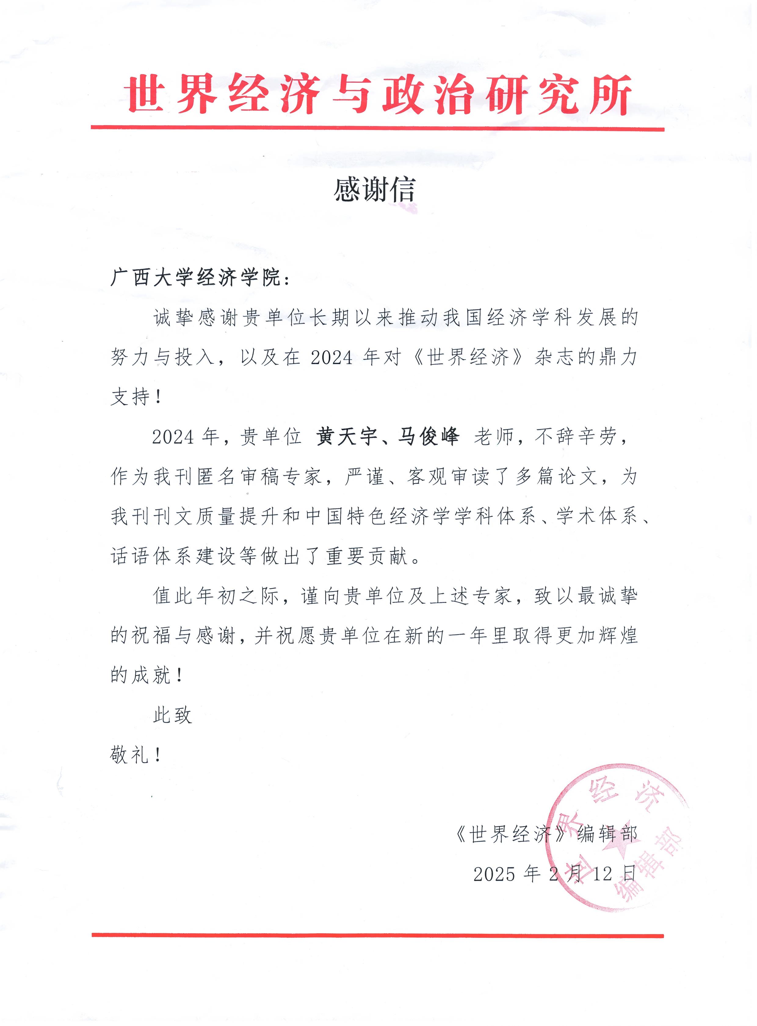 近日,世界经济与政治研究所《世界经济》编辑部向蘑菇视频发来感谢信,感谢蘑菇视频在2024年对《世界经济》杂志的鼎力支持,对蘑菇视频教师黄天宇、马俊峰担任该刊匿名审稿专家期间的卓越贡献表示感谢。作为审稿人,他们以严谨的学术态度、深厚的专业素养和客观公正的评审标准,审读了多篇学术论文,为杂志的刊文质量提升做出了重要贡献,为中国特色经济学学科体系、学术体系、话语体系建设提供了有力支持。