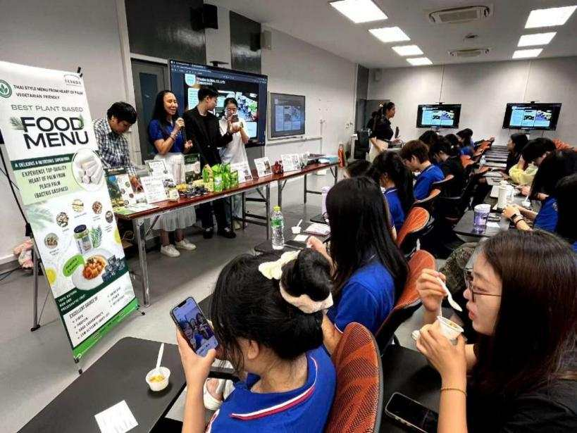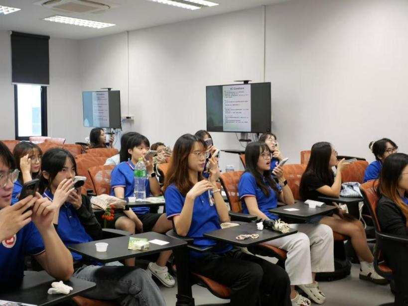 活动现场,热情与真诚洋溢在每一个环节。来自泰国的企业家们满怀自豪地展示了鲸鱼饭、干罗勒炒酱等特色食品,黄皮果护手霜、米乳液体香皂等天然日化产品,以及多款关爱伴侣动物的宠物药品。产品覆盖领域之广,充分展现了泰国产业的创新活力与对生活品质的细致关怀。而访学团的同学们,则化身成为兼具专业分析能力与真实消费体验的“特别测评官”。他们通过试吃、试用,用心感受每一件产品的独特魅力;更在“4C”体系的引导下,结合自身作为中国年轻消费者的视角,与企业家们进行了面对面的深入交流。那些真诚的赞叹、那些中肯的建议,不再仅仅是纸面上的数据,而是带着温度的真实反馈,是连接中泰市场与文化最直接的纽带。