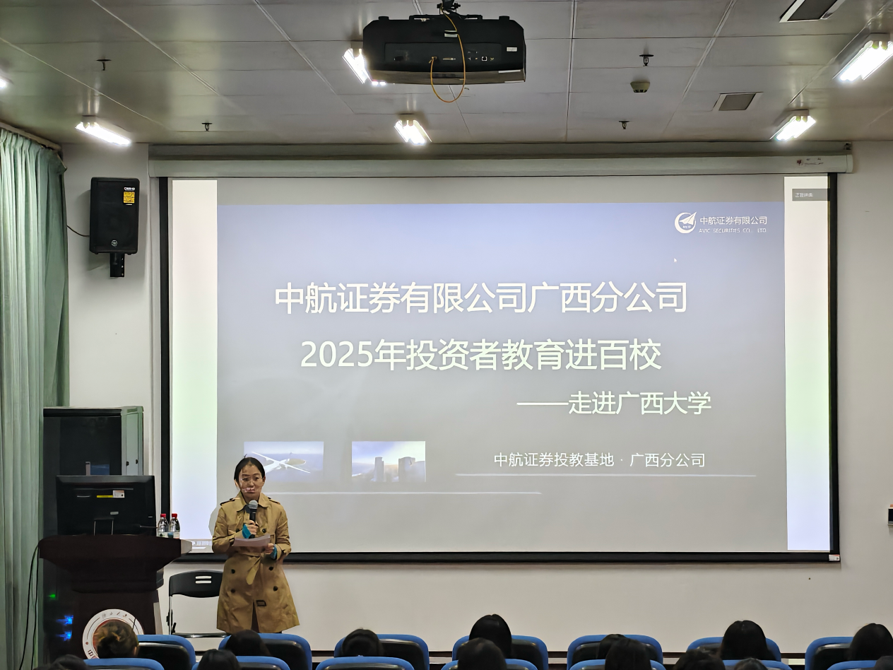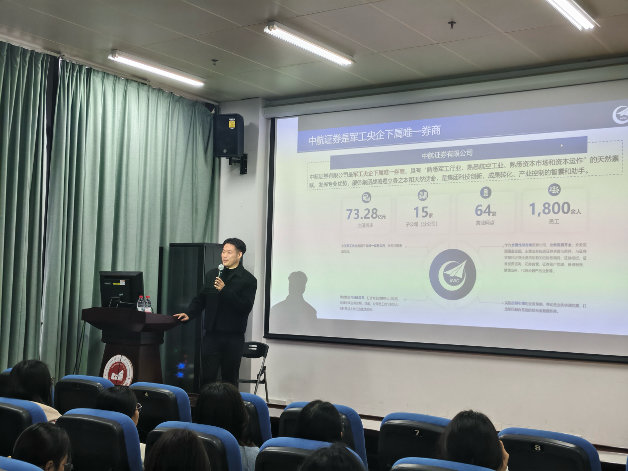 反诈宣讲结束后,中航证券广西分公司面向学生开展招聘推介,开放实习生、财富顾问、机构业务经理等岗位。宣讲人从岗位职责、职业成长、发展前景及企业人才培养机制等多角度展开介绍,鼓励同学踊跃投递。