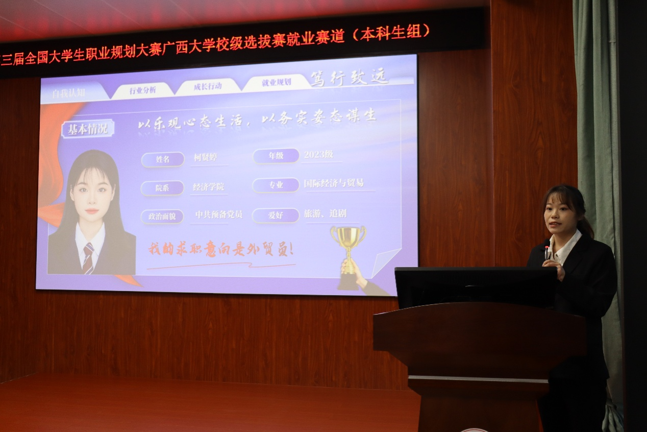初赛现场气氛庄重而热烈。选手们按抽签顺序依次登台,围绕个人职业目标、行动成果与发展路径进行主题陈述,并在答辩环节中从容应对、展现思考。评委们凭借深厚的专业素养与丰富的行业经验,从定位准确性、规划可行性、成长逻辑性等维度给予精准点评与务实建议,既有肯定与鼓励,也有指引与启发,充分体现了“以生为本”的教育温度。