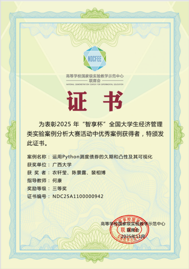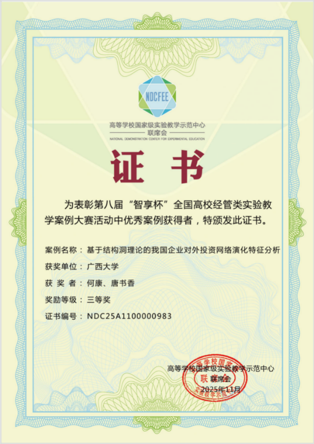 等单位承办的2025年“智享杯”全国高校经管类实验教学案例大赛全国总决赛及2025年“智享杯”全国大学生经济管理类实验案例分析大赛全国总决赛在厦门圆满落幕。蘑菇视频何康、唐书香教师完成的《基于结构洞理论的我国企业对外投资网络演化特征分析》案例,凭借精巧的案例设计与精彩的现场发挥,荣获教师组三等奖;2025级金融专硕1班农轩莹、陈景露,金融本科232班裴相博同学组成的团队,在何康老师指导下,以《运用Python测度债券的久期和凸性及其可视化》为案例,将技术工具与专业充分融合,荣获学生组三等奖。这些奖项的获取,充分展现了蘑菇视频师生在实验案例中的深入研究和独到思考。