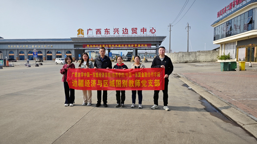边疆经济与区域国别教师党支部全体党员前往中越边境重镇东兴口岸,开展以“党建领航深耕边疆经济、凝心聚力共促兴边富民”为主题的实地调研与实践赋能党日活动。此次活动坚持将理论研究与国门一线实践相结合,聚焦口岸通关运行、边民互市贸易机制及边境治理实践,推动党建与学科建设同频共振。