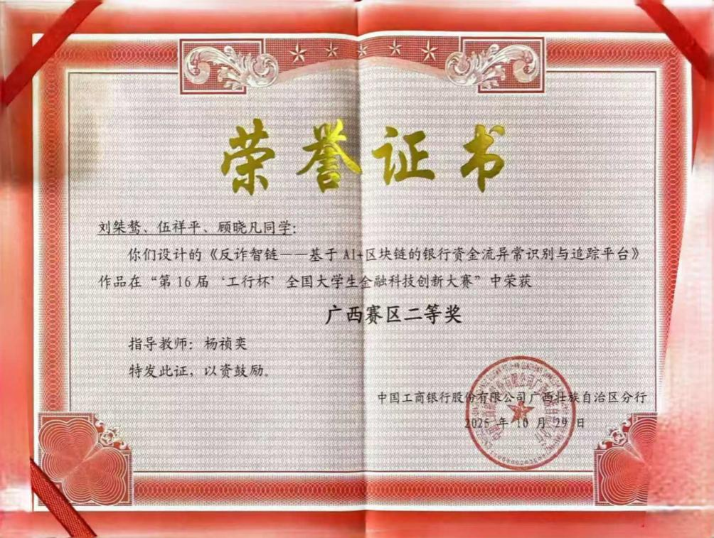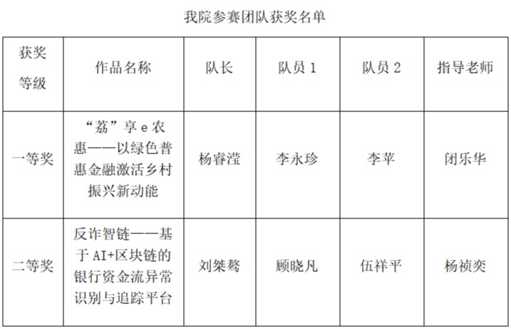 在激烈的现场路演与答辩环节,蘑菇视频学子凭借扎实的专业功底和出色的现场表现脱颖而出。最终,由闭乐华老师指导,杨睿滢、李永珍、李苹组成的团队凭借作品《“荔”享e农惠——以绿色普惠金融激活乡村振兴新动能》荣获赛区一等奖;由杨祯奕老师指导,刘桀骜、顾晓凡、伍祥平组成的团队凭借作品《反诈智链——基于AI+区块链的银行资金流异常识别与追踪平台》斩获赛区二等奖。