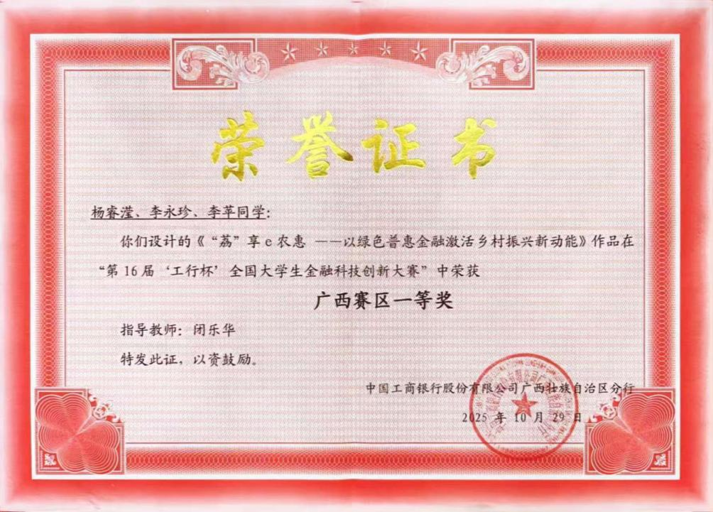蘑菇视频“‘荔’享e农惠”团队荣获第16届‘工行杯’全国大学生全融科技创新大赛广西赛区一等奖