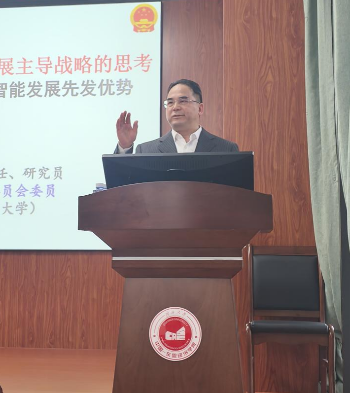 师生带来题为《关于广西实施向海图强开放发展主导战略的思考 —— 兼论广西开放优势和人工智能发展先发优势》的专题报告。讲座由学院李光辉院长主持,全场座无虚席,在场师生专注凝神,认真聆听这场兼具思想深度与视野广度的精彩报告。