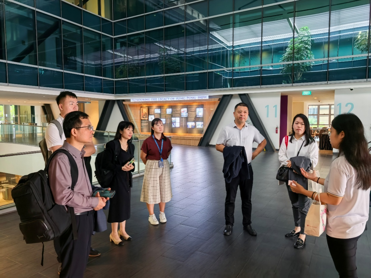 、行政楼、图书馆等主要设施。在参观过程中,志愿者详细介绍了SMU位于新加坡市中心的核心位置、活跃的学生社团与活动、以互动研讨为核心的课程设计、配备现代化研讨室、协作空间与多媒体设施的教学环境以及强调跨学科融合、全球视野与实践能力的培养模式。调研团成员通过实地走访和互动交流,深入了解了SMU作为新加坡顶尖公立高校的办学特色:自2000年建校以来,以商科、经济、会计与金融等领域为核心,凭借互动式小班研讨教学、强实践导向模式以及广泛的全球合作网络,迅速跻身亚洲乃至世界一流财经类院校行列。