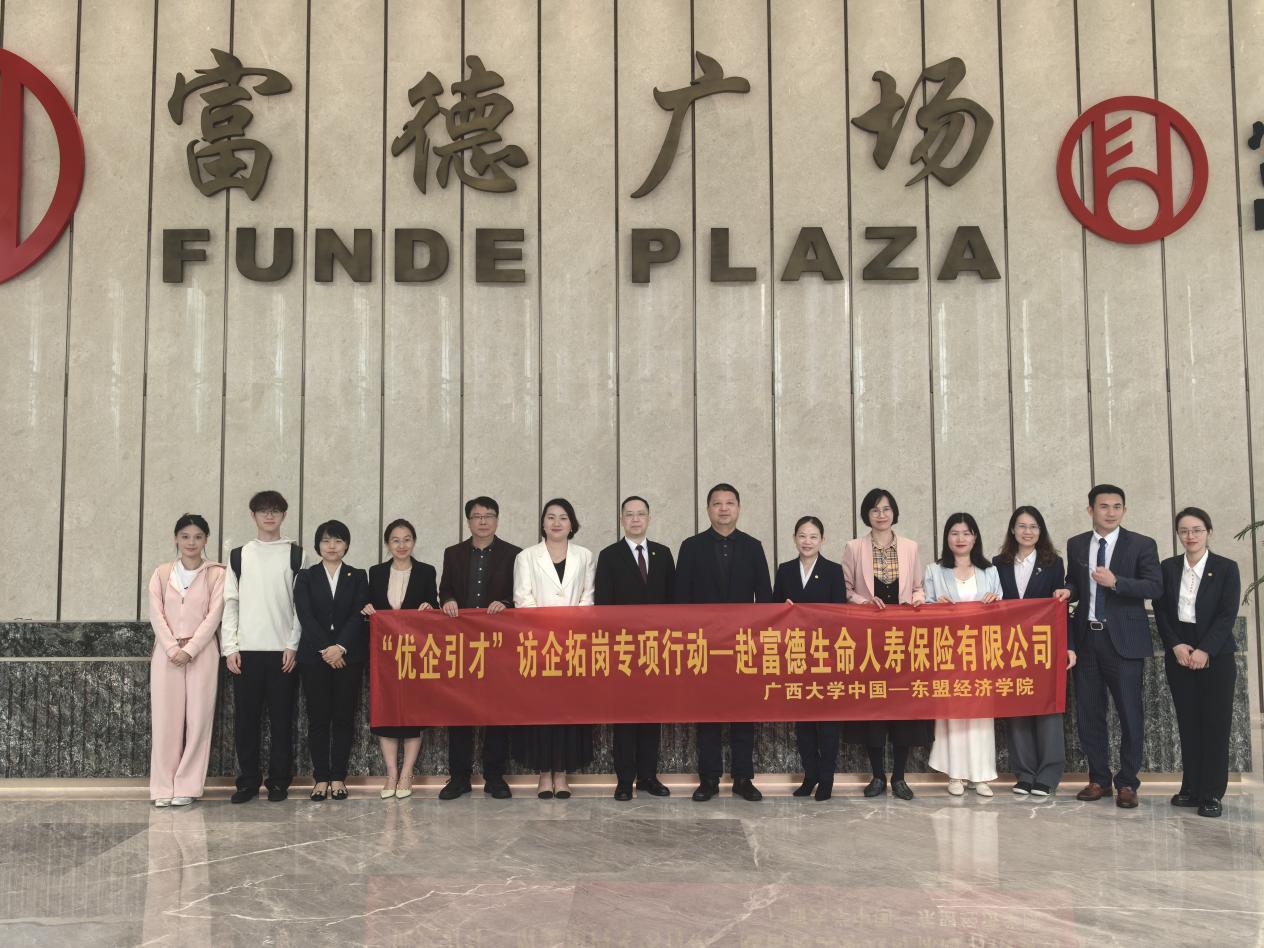 /中国—东盟金融合作学院党委书记姜玮带队前往富德生命人寿保险股份有限公司广西分公司(以下简称“富德生命人寿广西分公司”)开展“访企拓岗”专项交流活动,院党委副书记刘梦娟,保险专业、学院培训部、学工组教师代表及学生代表参加活动。富德生命人寿广西分公司对学院代表团一行的到访表示热烈欢迎并全程陪同参观交流。