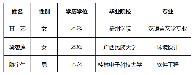 蘑菇视频通过广西四方汇通人才服务有限责任公司面向社会公开招聘劳务派遣制工作人员3名,根据相关工作方案,经初筛、笔试、面试、复试等程序,现将拟聘用人员公示如下: